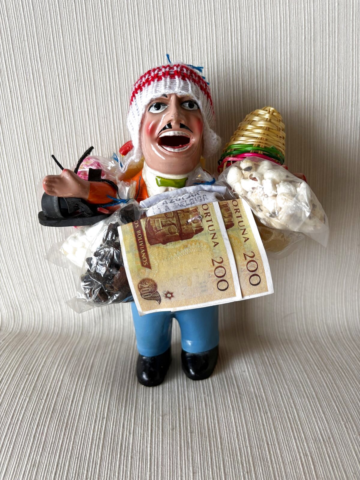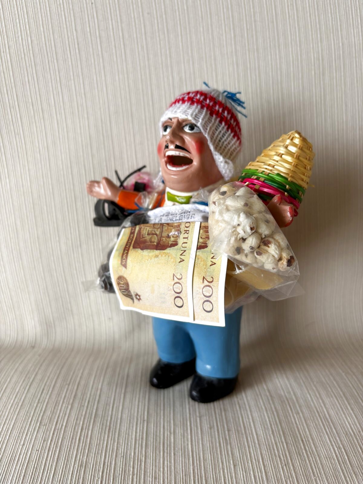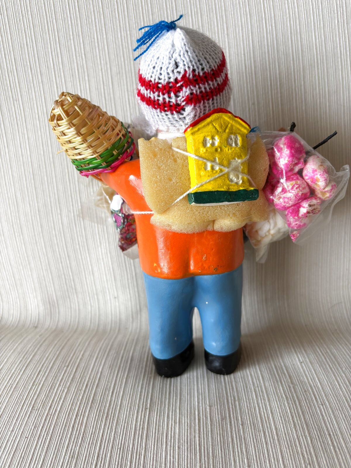 エケコ人形は、アンデス地方で信仰されている守護神であり、繁栄と幸福をもたらすとされています。ちょっと怖顔が魅力的な特徴あるエケコです。お顔にもツヤがあり、ミニチュアを沢山背負っていて、富と幸福を象徴しています。