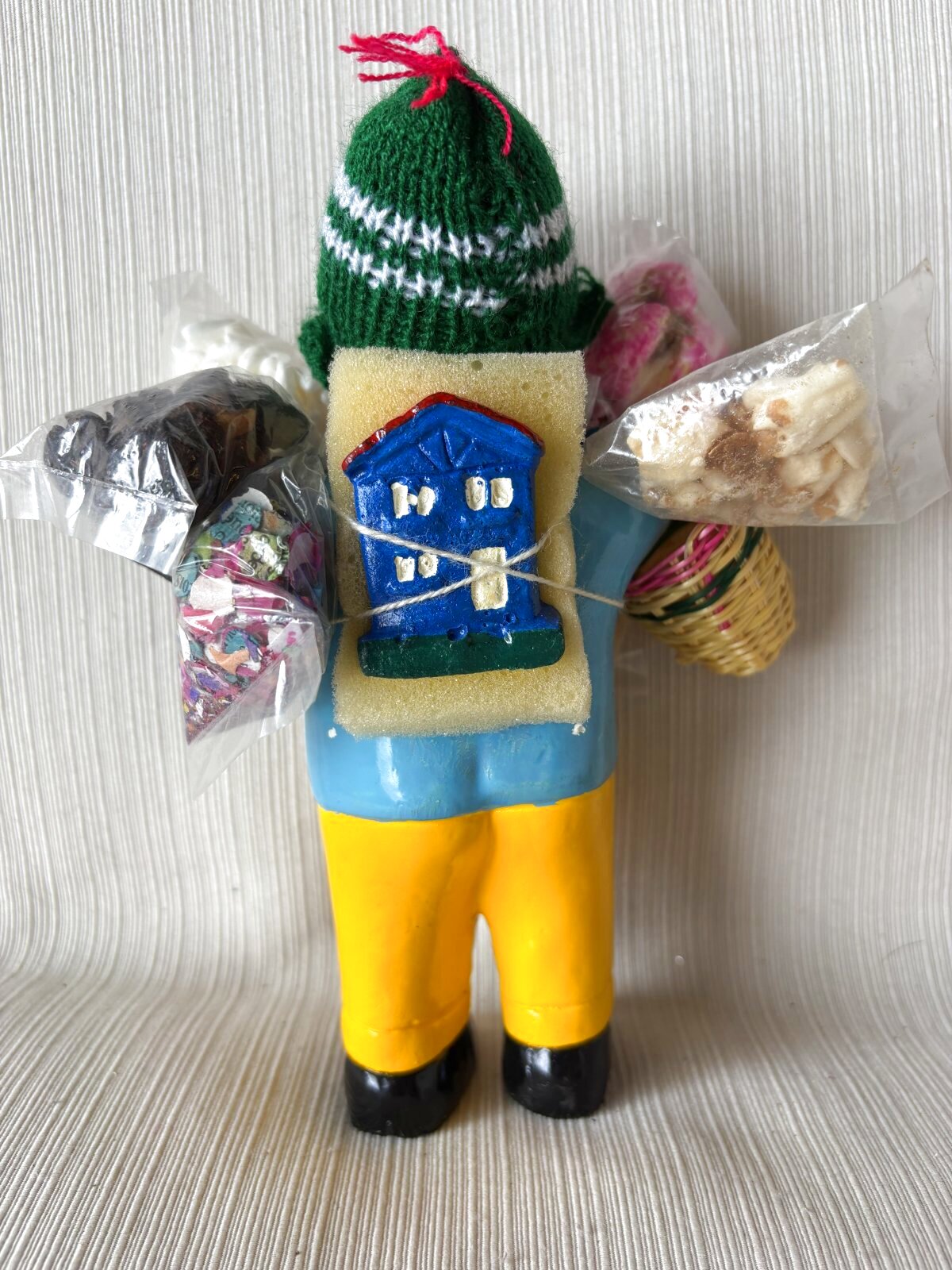 エケコ人形は、アンデス地方で信仰されている守護神であり、繁栄と幸福をもたらすとされています。ちょっと怖顔が魅力的な特徴あるエケコです。お顔にもツヤがあり、ミニチュアを沢山背負っていて、富と幸福を象徴しています。