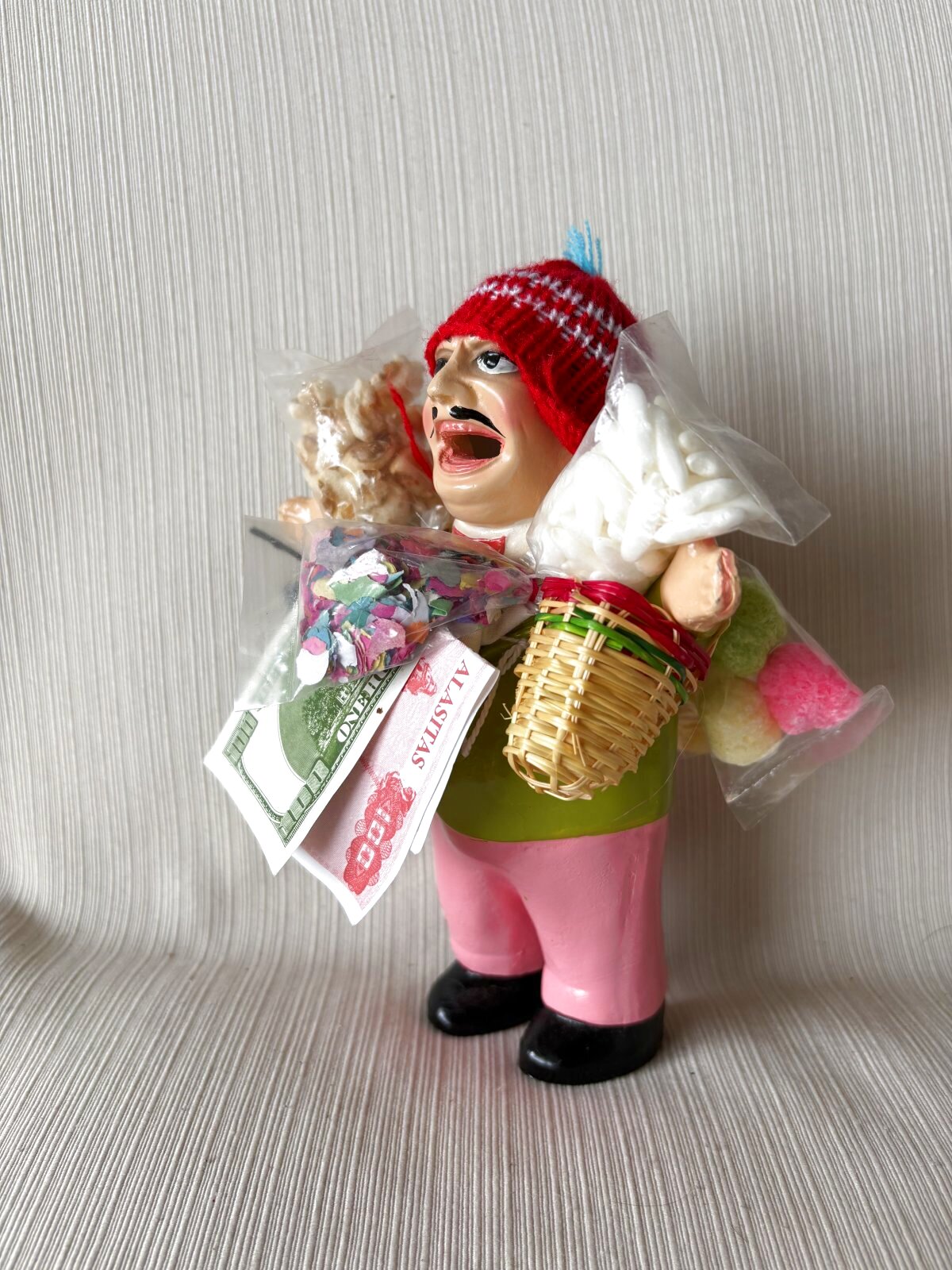 ボリビアではごく普通にお目にかかります。店頭、家の中、キリスト像の神棚等に。。小太りでチョイひげを生やし、お顔も現地顔、目の青いヨーロッパ顔など色々。エケコは通常、家、車、テレビ、お札、穀物、楽器などを背負っていますが、(これらを手に入れるのはボリビア人たちの夢です)最近は、パスポート、結婚証明書、大学卒業証明書、更には保険証などリアルです。パスポートもきちんと中身が印刷されています。現地では実際更に、花びらやお酒などをかけシャーマンみたいな人にチャヤという儀式をしてもらいます。タバコはこちらではメンソールなど見た事が無く、普通の黒タバコを吸わせたり、殆どは煙を吹きかけます。勿論願いをかけて・・そうすると、エケコの担がせた物類が実際届くと云われています。